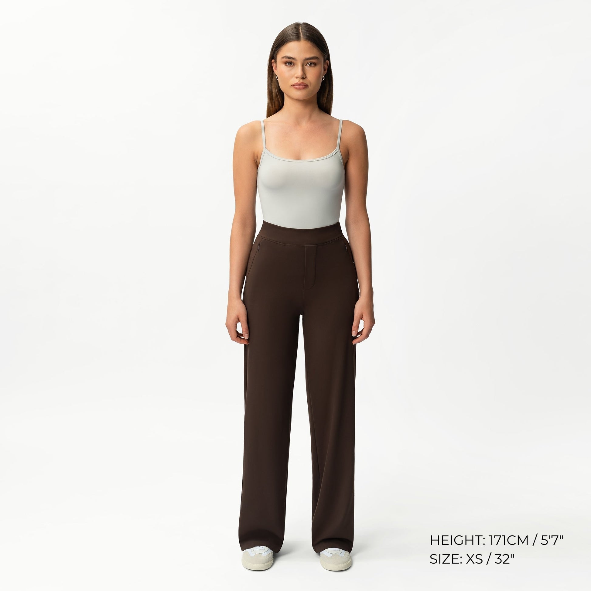 These peach soft "wear-for-everything" pants are tailor-inspired trousers re-imagined with all the comforts of activewear. They are designed with discrete zip pockets, a relaxed & straight fit, a high centrefold waist and using a soft brushed activewear knit. They're ideal for everyday casual outfits, work, dance, travel and lounging.